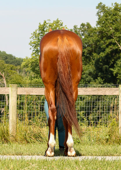 "Roo," is sound, wonderful to handle in the barn and has no vices. He's been under saddle with us just recently and has done well in the round pen and has gone for a walk around the training track on the farm without issue. He goes out with geldings and can definitely be on the playful side!
